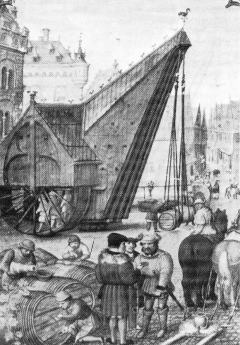 ネーデルラント(ブリュージュ)では中世から木製クレーンが利用されていた。この絵では、車輪のなかにいる数人が歩いて車輪を回すことで動力を生み出している。水の流れが利用できる場所では水車で動力を得ていたようだ。クレーンは造船や船荷積み降ろし、建築でも利用された。