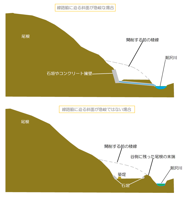 | 上の絵図は、廃線敷遊歩道が石している地形の断面を大雑把に表現したものです。傾斜などは誇張してあります。 旧国鉄篠ノ井線の線路は、潮沢川の左岸にあって、南側から谷に張り出している尾根を切通し開削してつくった段丘面を路盤としています。 ここでは、開削した結果、線路脇に迫る斜面が急峻になった場合とそれほど急峻ではない場合の2つに分けて、路盤の地形を説明することにします。あとの方の場合、稜線の傾斜が緩やかで長いので、谷側に尾根の末端が小丘として残っているものとしました。 線路わきに迫る斜面が急になった場合には、土砂崩れ(斜面の土砂崩落)が起こる危険があるので、石垣を施したり、さらにコンクリート擁壁を施して安全を確保する必要がありました。 |