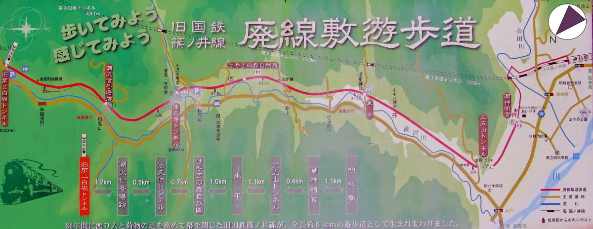 | 上掲の絵地図は、廃線敷遊歩道の起点、第2白坂トンネル跡駐車場に立つ案内板を撮影したものです。左下方向が北です。 遊歩道の道のり(長さ)は、JR明科駅からだと約6キロメートル、潮神明宮からは約5キロメートルです。 旧篠ノ井線は、潮沢川の渓谷の左岸に設けられています。その理由は、右岸の山腹斜面の傾斜の方がずっと大きいからで、当時の技術では開削工事そのものがより難しく危険になり、ここを通すとトンネルの数がはるかに多くなるからです。 |