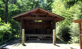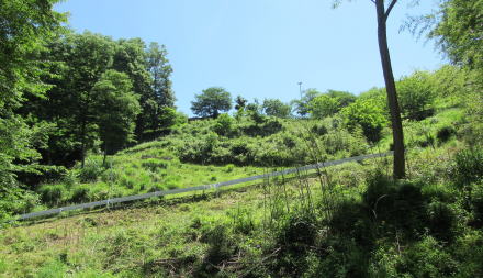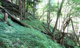 開けた草地に丸太のベンチを置いた休憩所が設けられている。谷の背後の山腹は森が伐採されたあとの草地や背の低い叢林となっているので、そこから東側に、急勾配の尾根斜面を見あげることができる。斜面の上の山腹高台には、かつて集落があったという。