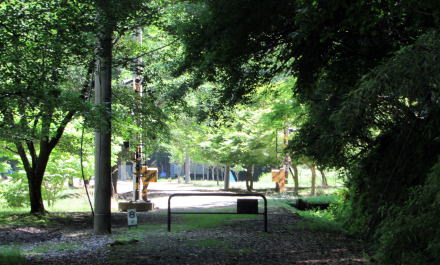 けやきの森自然園から西の遊歩道には路盤のバラストが残されていて、そこにところどころ土を盛った、歩きやすい路面となっている。標高はこの辺りで600メートルを下回ることになる。