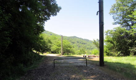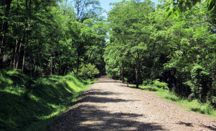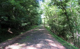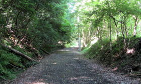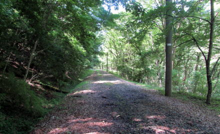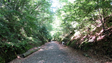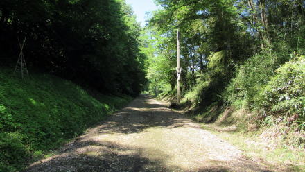 ここでは、国道403号からのぼってくる林道が廃線敷遊歩道と交差する。この林道は、かつては谷の奥にあった村落に行き来する道だったようだ。