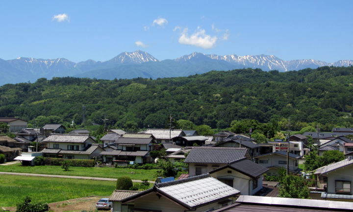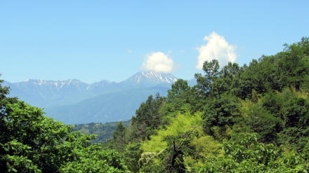 この辺りから西におよそ2キロメートルのところで、廃線敷遊歩道は潮沢川の谷間から安曇野に出ることになる。そこから犀川を1キロメートルくらい遡った左岸には、ワサビ田が連なる北穂高の集落がある。その西方の彼方に位置する北アルプスの連峰を、この辺りの廃線敷遊歩道から西に遠望できる。