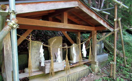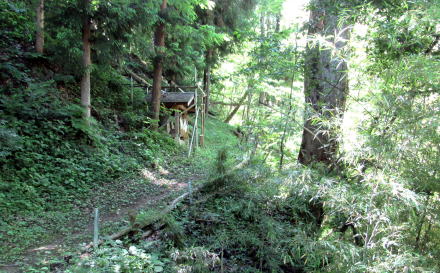 覆い屋の背後は谷間の縁の険しい斜面