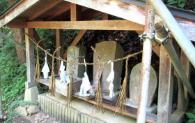 ここで、この遊歩道から分岐して谷を見おろしながら南に進む細道を見つけた。細道は谷に落ち込んでいく急斜面にある。その道脇に道祖神の小さな覆い屋を見つけた。覆い屋のなかには、石塔に文字を刻んだ道祖神と庚申塔、そして双体道祖神を浮彫りにした舟形の石の3体が祀られている。