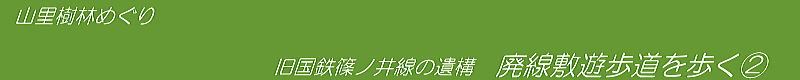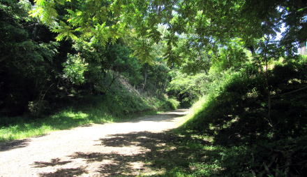 しかし、西に100メートルも進まないうちにふたたび深い山林のなかに入っていく。幅広の尾根の背がが潮沢の谷に迫っているのだ。とはいえ、遊歩道に迫る尾根の傾斜はずっとゆるくなって、廃線敷の幅も広くなっている。鉄道建設のさいに、ほかの場所で尾根から削り取った土砂を盛って路盤幅を広げてあると見られる。