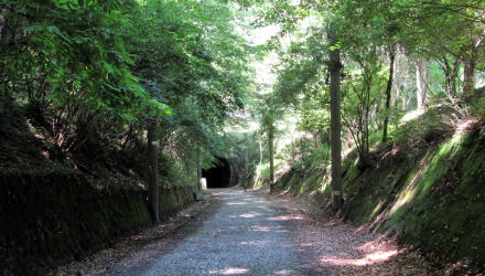 トンネルの入り口までは、緩い勾配の山腹斜面を切り通して長さ200メートルほどの鉄道路盤を敷設してある。だから、廃線跡は、両脇が切り立った谷底を直進するという形になっている。