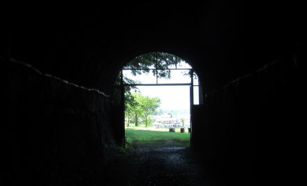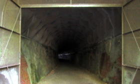 廃線敷遊歩道を散策する観光客のために、トンネル内に入るとセンサーが感知して左右両側の電球が点灯するようになっている。それでも中はかなり暗くて、足元が頼りない感じがする。出口から外光が射してきた時には安堵感が込み上げてきた。