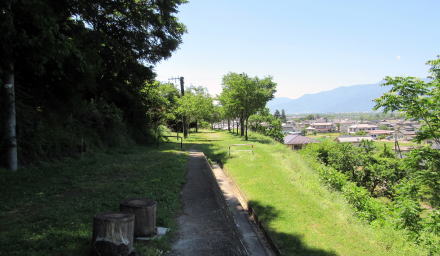 山林のなかでトンネルに進入したけれども、出てみると景色は一変し、明科の市街地の風景となる。街並み風景を右手(西側)に見渡しながら廃線敷の段丘面の上を往くことになる。草地となっている遊歩道の両側には、桜並木が続いている。春にはみごとな桜の花見場所となるのだろう。桜の間にはところどころ廃線遺構の電柱が立っている。
