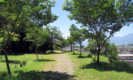 桜の樹間から、明科の街の西側に北アルプスの連峰を眺望できる。蝶ケ岳から北側に常念岳を中心にして燕岳まで残雪の美しい稜線を眺めることができた。ここからは見えないが、この山並みの背後には穂高連峰から槍ケ岳までの壮麗な光景が続いているはずだ。