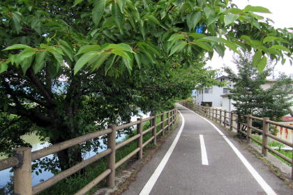 ▲堰河畔の桜並木に沿って伸びる自転車道