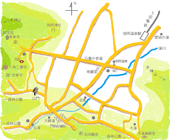 さて、常楽寺の境内を出てすぐ西側(常楽寺の駐車場の上)には、なにやらゆかしい風情の茶店があります。この茶店の庭からの眺めはすばらしい。別所 温泉街や北向観音、塩田平を一望できます【写真下】。