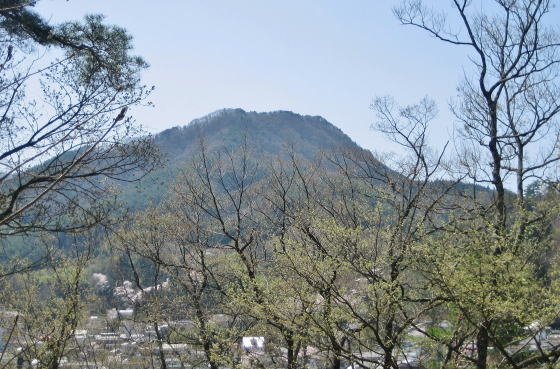 冬から春先にかけて、木々の枝葉が繁る前には、別所と塩田平を展望するパノラマが開けています。この光景は、女神岳の山麓に位置する別所温泉の街集落です。