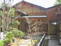 大師湯の横の橋を渡って斜面を上ると、和風の庭園と建物が粋な旅館の前に出ます。