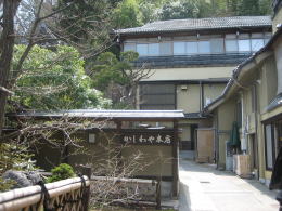 さて黒門から湯川の谷に下りて、橋を渡った途端、北向観音門前の商店街になります。だが、商店街に入らずに、参道を右に折れて谷に沿って歩きましょう。