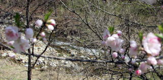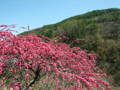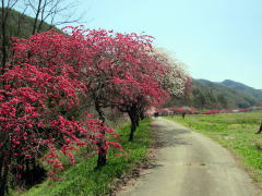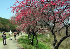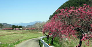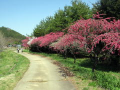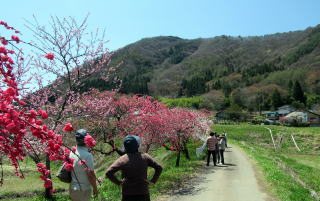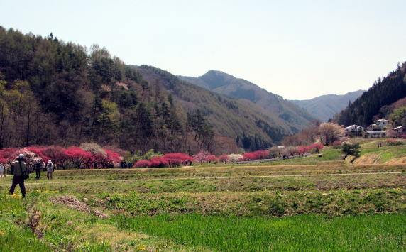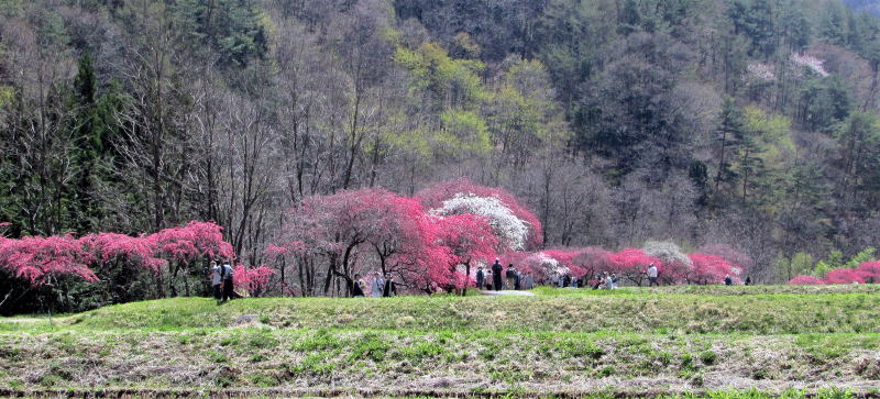そんな谷間を余里川は西に東に蛇行しながら流れ下り、今回取材した下流部では谷の東端に寄って流れていきます。およそ2000本の花桃は、およそ4キロメートルにわたって主に余里川の河畔に沿って植えられています。