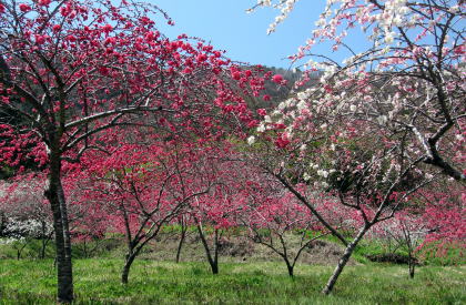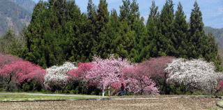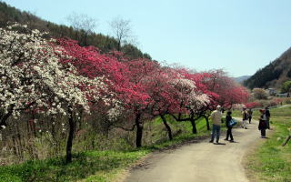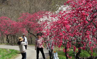 花の色は大雑把に分けて3色、白、紅、桃色です。中国古代の古典に陶淵明の『桃花源記』――桃の花が咲くユートピアに旅する物語――があります。その夢の里は桃源郷と呼ばれていますが、ここは現代の桃源郷です。