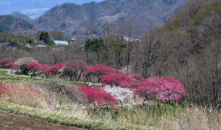 ▲棚田が続く谷の東端に並ぶ花桃