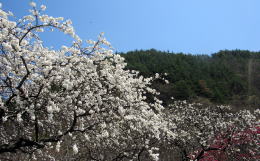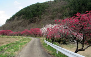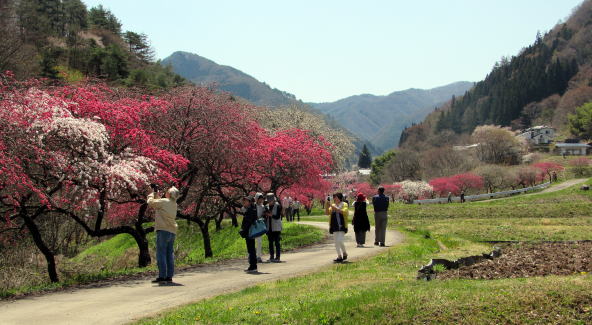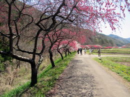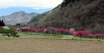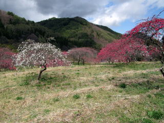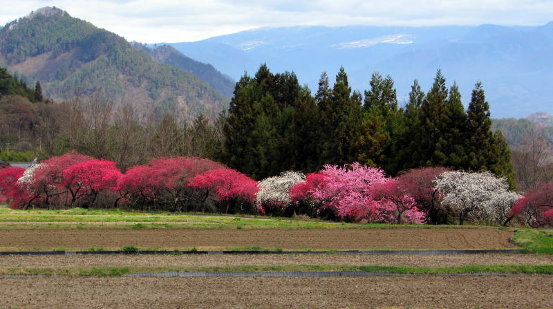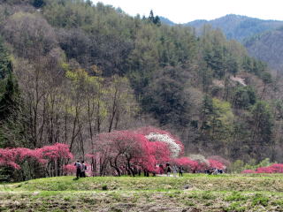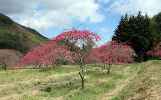 写真:余里川の谷間の花桃の並木。雲に隠れた背景は蓼科高原。 |