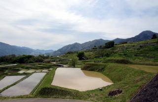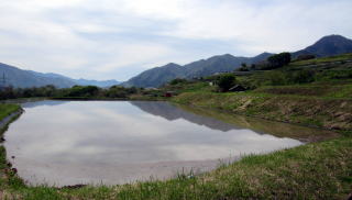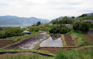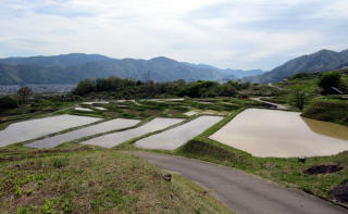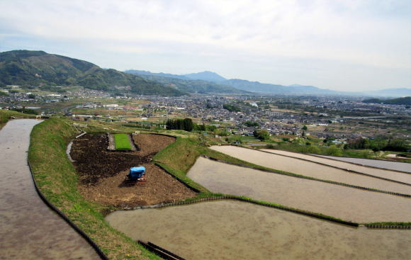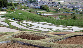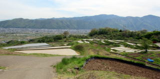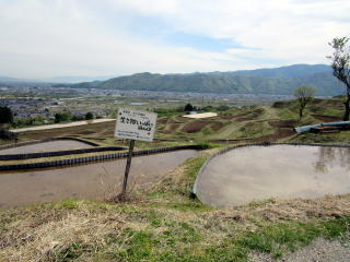 ▲耕した棚田に高原から引いた水が張られる。その向こうに善光寺平の風景。