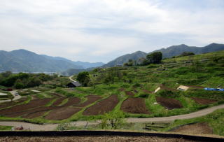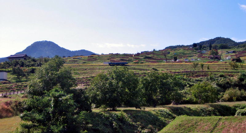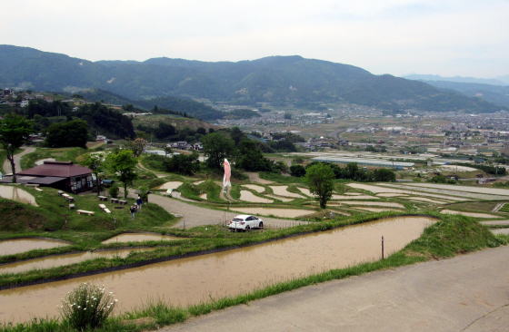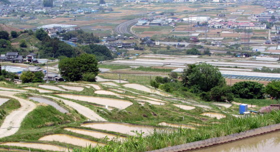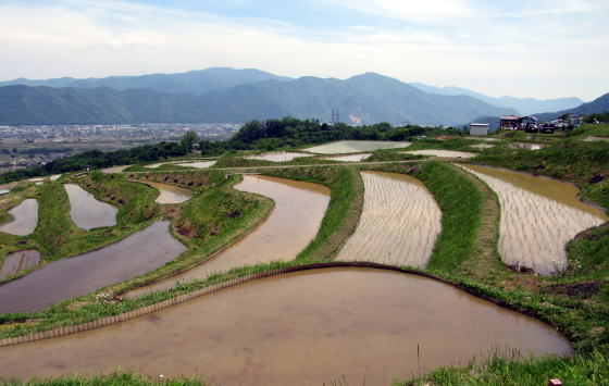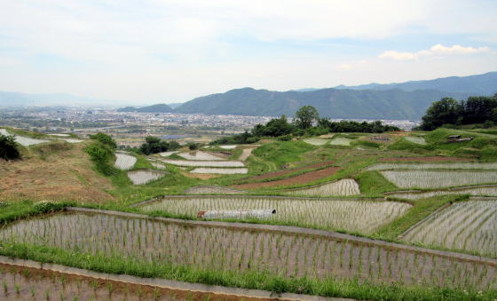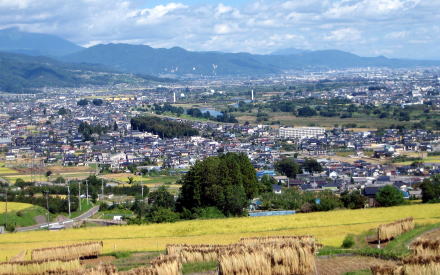 姨捨の棚田地帯は千曲川を見おろす北東向き斜面で、眼下に善光寺平の風景を眺望することができます。