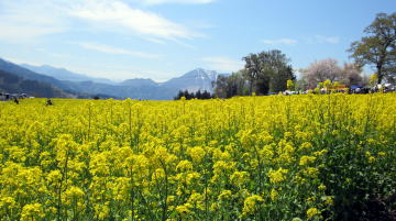 小菅山の麓、飯山市瑞穂の千曲川河畔の丘の上に菜の花公園があります。耕作されなくなった水田畑作地帯の河岸丘陵に野沢菜を植えて広大な菜の花畑に仕立てました。 公園の背後の山裾には――映画『阿弥陀堂だより』のシーンとなった――瑞穂棚田や神戸の大イチョウがあって、季節ごとに人びとが訪れます。