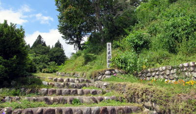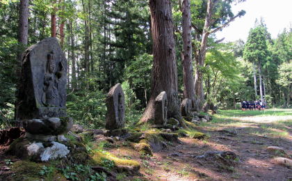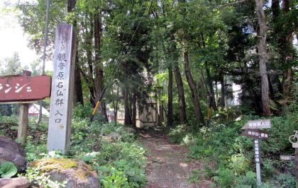 私は、県道433号に続く小径を南に折れて森に入り、千国街道塩島新田宿の集落に続く坂道の上にある「観音原石仏群入り口」の案内標柱から始まる遊歩道を往くことにしました。
