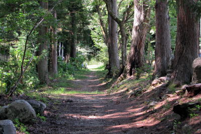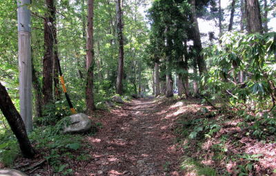 この遊歩道は環境省の「中部北陸自然歩道」に属す小径で、塩の道に沿って整備されたもののようです。とはいえ、この遊歩道が塩の道と一致するかどうかは不明です。しかしながら、往時、塩の道がこのような鬱蒼たる森のなかを往く小径であったという趣は確実に復元されています。