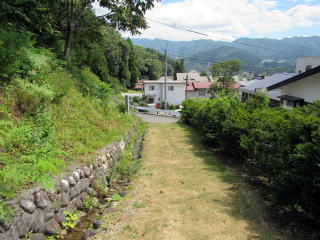 観音原は、松川の浸食で形成された河岸段丘の最上部の丘陵の森林のなかに位置しています。この丘陵の東端を楠川が流れていて、狭い谷間を形づくっています。2つの川は相互に衝突し合うように姫川に流れ落ちながら、複合扇状地を形成したようです。