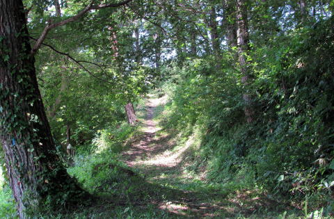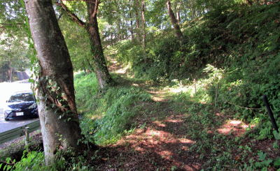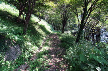▲山麓、県道433号脇に遊歩道がある。これが岩岳山麓めぐりの「尾花道」だろうか。