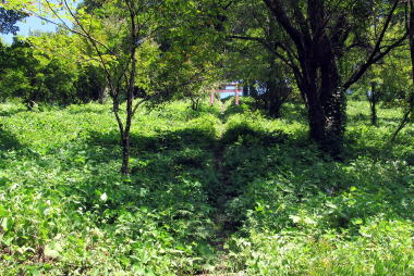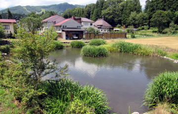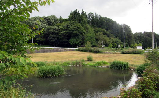 鯉池と伝行山: 池と伝行山麓のあいだには、緩やかな斜面の野原がある▲