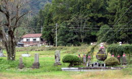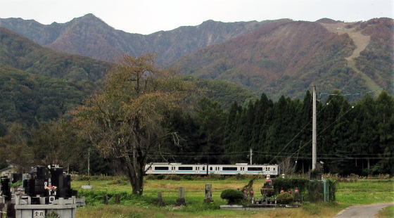 庚申塚石仏群は墓地や石地蔵などがある広場の北端にある(背景は大糸線の列車と五竜岳)▲