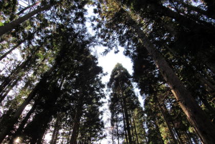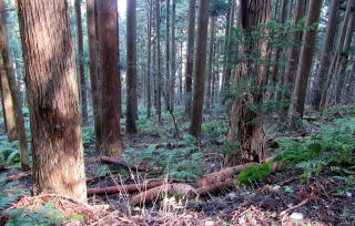 豪雪地帯なので、標高が低いにもかかわらずまれにブナの大木が見られます。落葉広葉樹のなかで明るい灰色の樹皮で、梢に細かい小枝がない樹々はホウノキで、樹下に大きな楕円形の落葉が集まっています。