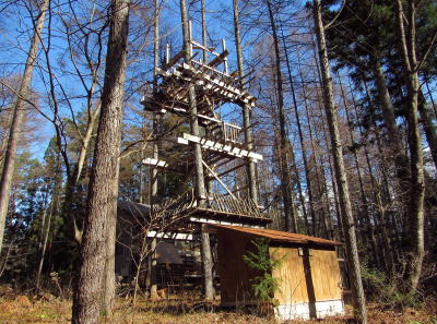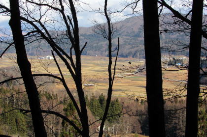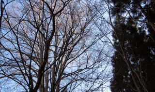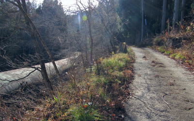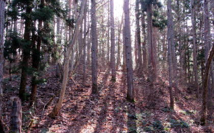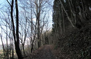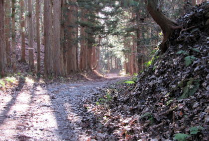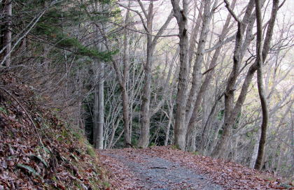 佐野坂峠を往く千国街道は、白馬村と大町市の境をなすなだらかな――西から東に延びる――尾根を越える山道です。さのさかスキー場から始まる坂は緩やかで、街道は尾根の山頂部(標高930メートルほど)とその東側の小峰(標高850メートルほど)のあいだを抜けて青木湖畔まで続きます。 ◆初冬の山林を歩く◆ 峠歩きをするためには、さのさかスキー場駐車場にクルマを停めておきますが、その辺りでだいたい標高780メートル。峠道の最高地点が標高850メートルほどです。駐車場とスキー場のあいだをJR大糸線が横切っています。そして、峠道登り口付近は鉄道(雪洞蓋)に沿っています。 峠道を取り囲む山林は、戦後に植林された杉がほとんどで、わずかカラマツが混じった針葉樹林ですが、、ところどころ落葉広葉樹の樹林が割り込んでいます。広葉樹は主にミズナラですが、ところどころにホウノキ、ごくまれにブナが見られます。街道の道脇にはかつては山桜の並木があったようですが、みな老古木で、ごくまれに今でも生き残っています。