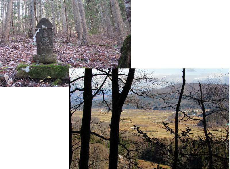 【左上】佐野峠の塩の道沿いにある石仏 【右下】峠道から白馬村神城を見おろす : 街道沿いなので、石仏はおそらくは馬頭観音像だろう。