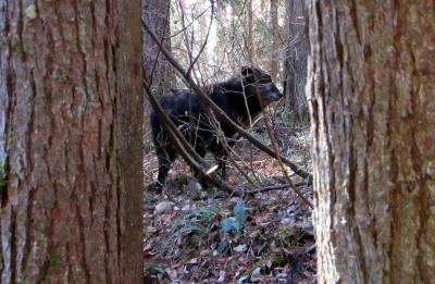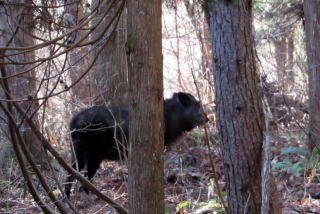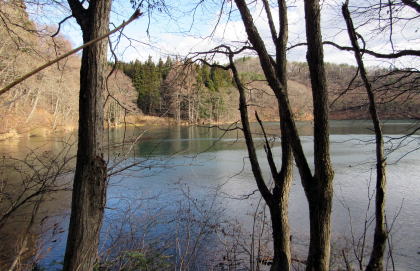 ◆峠道の最高地点から湖にくだる◆ 峠道の頂部にさしかかる寸前に、西側の樹林斜面に大きなカモシカいるのに気がつきました。互いに偶発的に出ったようなものですが、カモシカは泰然としています。人を怖れる気配はありません。私は来た道をを少し戻って距離を取り、カモシカの姿を撮影しました。