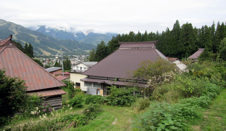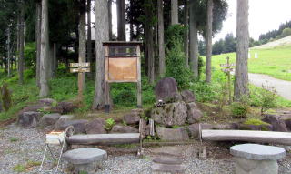 天満宮の南側には、山林を切り開いた草原斜面が広がっています。これは、かつてのスキー場の跡で、25年以上前までは多くのスキーヤーで賑わっていたそうです。それ以前は、ここは茅場で、茅葺屋根を葺くための材料を育て刈り取り、乾燥させていたのだとか。白馬村や小谷村では、かつての茅場は山腹斜面の起伏をならしてあるので、その多くがスキー場のゲレンデとなったそうです。