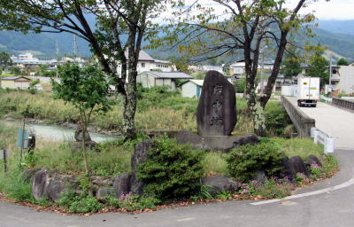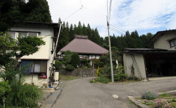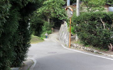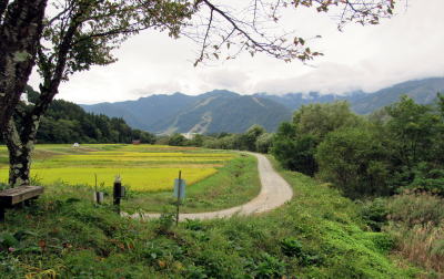 尾根の麓には姫川に沿って河岸段丘が広がり、広大な稲作地帯となっています。そろそろ収穫期に近づいて黄色味を増した稲田を見おろしながら集落に近づくと、分岐点に差しかかります。右手の道は北野天満宮を経て集落南部にのぼる小径。左の道は集落の中心部に往く道です。