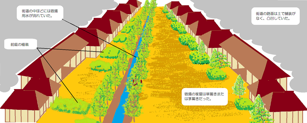 ところで、平地では新たに一から宿場街を建設する場合には、街道づくりの原則として、街道の道幅は6間ほどにして中央部に用水を通して用水沿いに並木を植え、両側の家並みの前に各戸ごとに2間幅ほどの前庭植栽をつくらせました。したがって、街道の中央部と両側に並木や植栽のグリーンベルトがともなう街道景観が形成され、世界的に先進的な道路=都市環境を用意したのです――家屋はややみすぼらしかったのですが。