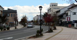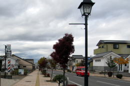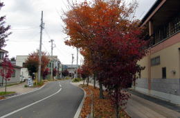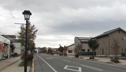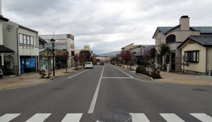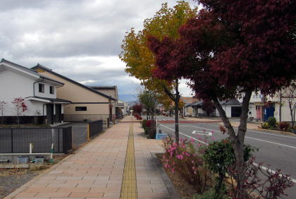 上信越自動車道を東御・湯ノ丸インターで降りて、立科町・丸子方面に向かう一般道で丘陵を南に下っていく途中に常田南交差点がります。そこを右折して西に向かい、田中駅をめざします。すると、ゆったりとした車道の両側に幅広の歩道が整備された明るく開放的な街並みに出会います。