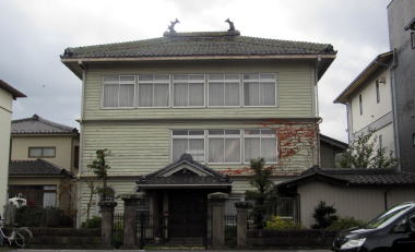 このほかにも、狭い路地をたどって歩くと、いろいろなレトロな風景に出会うことができます。私は、屋敷神――たぶん稲荷祠――を祀った和風の庭園がある屋敷を見つけました。江戸時代には、旧北国街道沿いに間口が狭く深い奥行きの町家敷地が短冊状に並んでいて、店舗家屋の奥に中庭や奥庭があって、その一隅に小さな社祠が安置されていたのだろうと想像しました。
