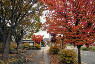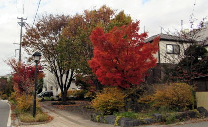 2ブロック北に行くと、カエデやケヤキなどがある小さな緑地があります。そこは里山庭園風の一角で、私が訪れた11月半ばには紅葉の盛りとなっていました。