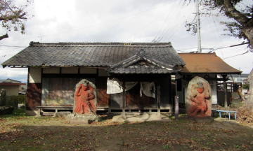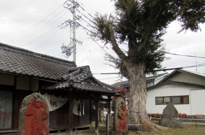 歯科医院の昭和レトロな造りの家屋を過ぎて、さらに東に進むと、大きなケヤキの古木の脇に瓦葺きのお堂があって、その東側に草地が広がっています。「たなか散歩道」の絵地図によると、石の仁王様が一対立っている広場というか境内のようです。