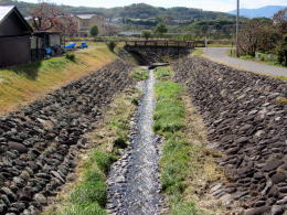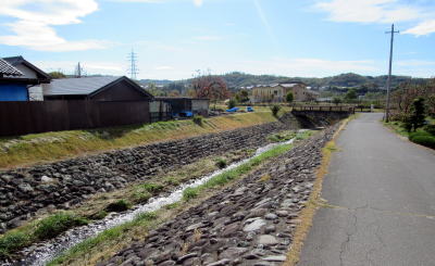 ▲成沢川堤防は石垣で強固に護岸