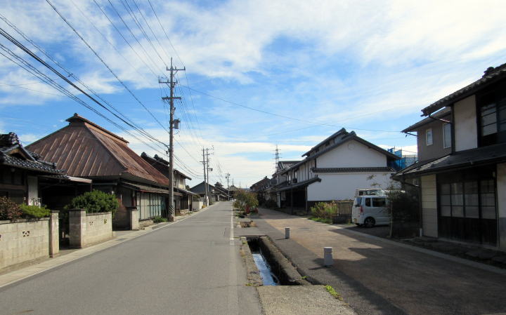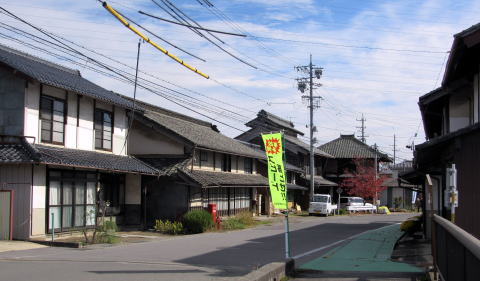 西桝形跡から200メートルほど進むと、街道北側に心光寺のお堂があります。街道の両側には、大きな床面積で瓦葺きの古民家が並んでいます。なにやら昭和レトロな家並み、何か癒される場所です。