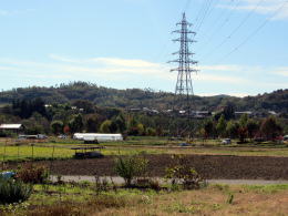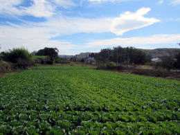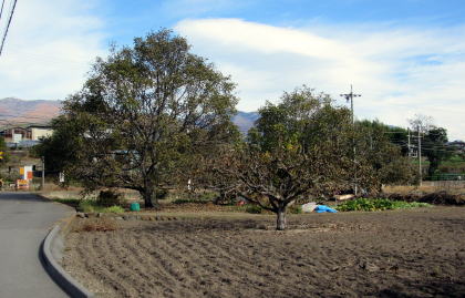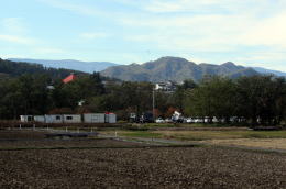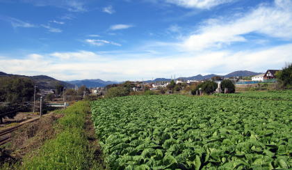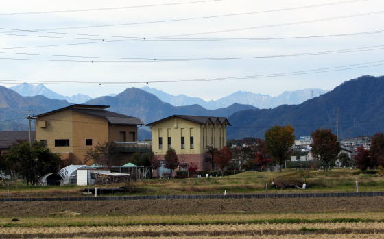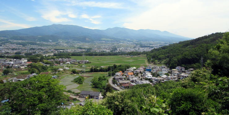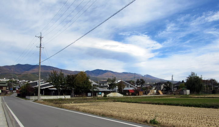 ▲町の北東方向の山々:左から烏帽子岳、湯ノ丸高原、高峰高原、黒斑山。黒斑山の左にわずかに浅間山山頂がのぞく(街の南側の田園から撮影)