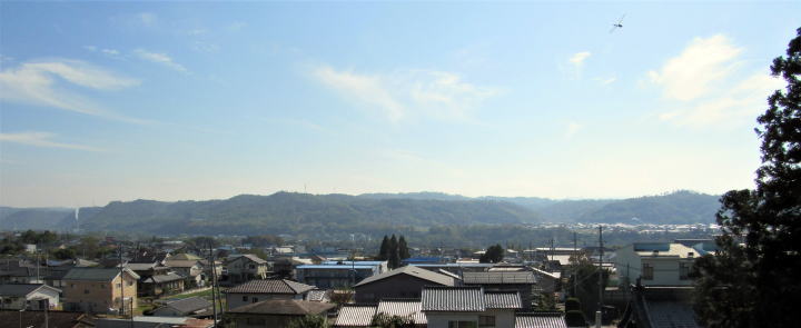 ▲大きな3つの段丘のうちの2段目のそのまた高台に位置する光前寺から海野宿方面の眺め。正面の丘の下を千曲川が流れ、そのすぐ手前 右側に海野郷がある。光前寺の境内と海野宿との高低差は20メートル近くある。