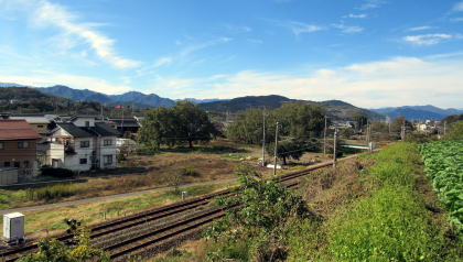 ▲町の南西(千曲川対岸)には、田園の彼方に丸子から塩田方面の峻険な稜線が見える
