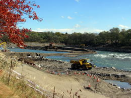 ▲街の南の河岸段丘の下を流れる千曲川:水害の修復工事中。右端は築堤の桜並木。