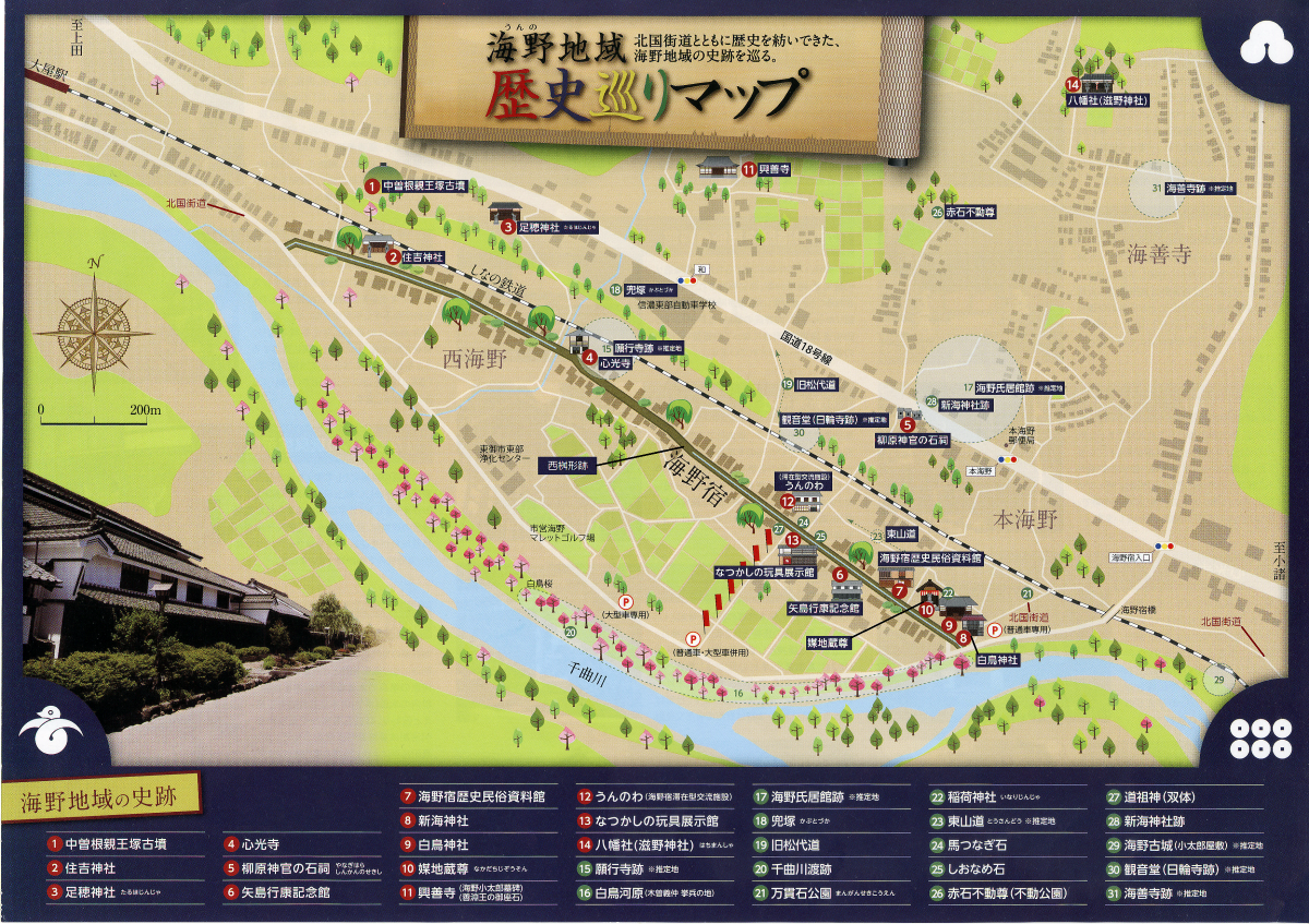 上掲の絵地図は、東御市商工観光課が発行している「海野地域歴史巡りマップ」に少し修正を加えた絵地図です。この絵地図は「北国街道とともに歴史を紡いできた、海野地域の史跡をめぐる」というテーマで制作されたものです。